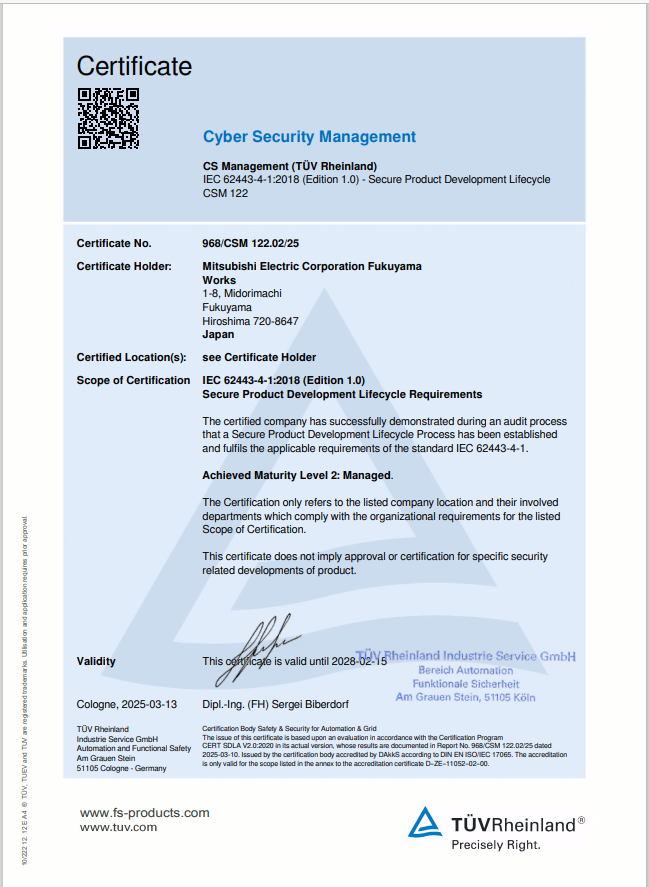 FAシステム事業の開発・製造拠点である名古屋製作所、産業メカトロニクス製作所および福山製作所では産業用オートメーションと制御システムのセキュリティ開発ライフサイクルに関する国際標準規格「IEC※ 62443-4-1」の認証を取得し、この要件を満たしたセキュリティ開発ライフサイクルの運用を行っております。