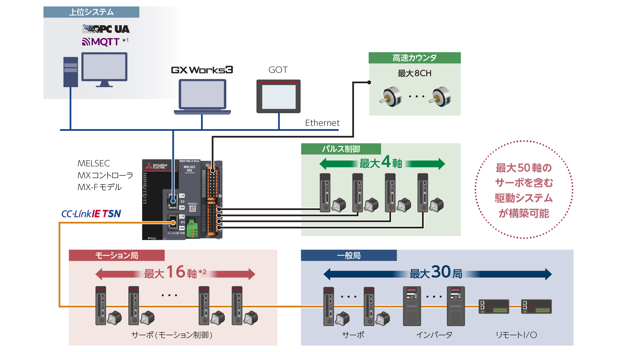 MX-FモデルはMELSEC iQ-Fシリーズの各種ユニットと組み合わせることで、多様かつ高度なシステムが構築できます。