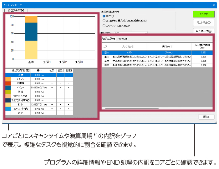 パフォーマンスモニタで、プログラム実行を割り当てたコアごとの演算周期の内訳や負荷状態を見える化できます。