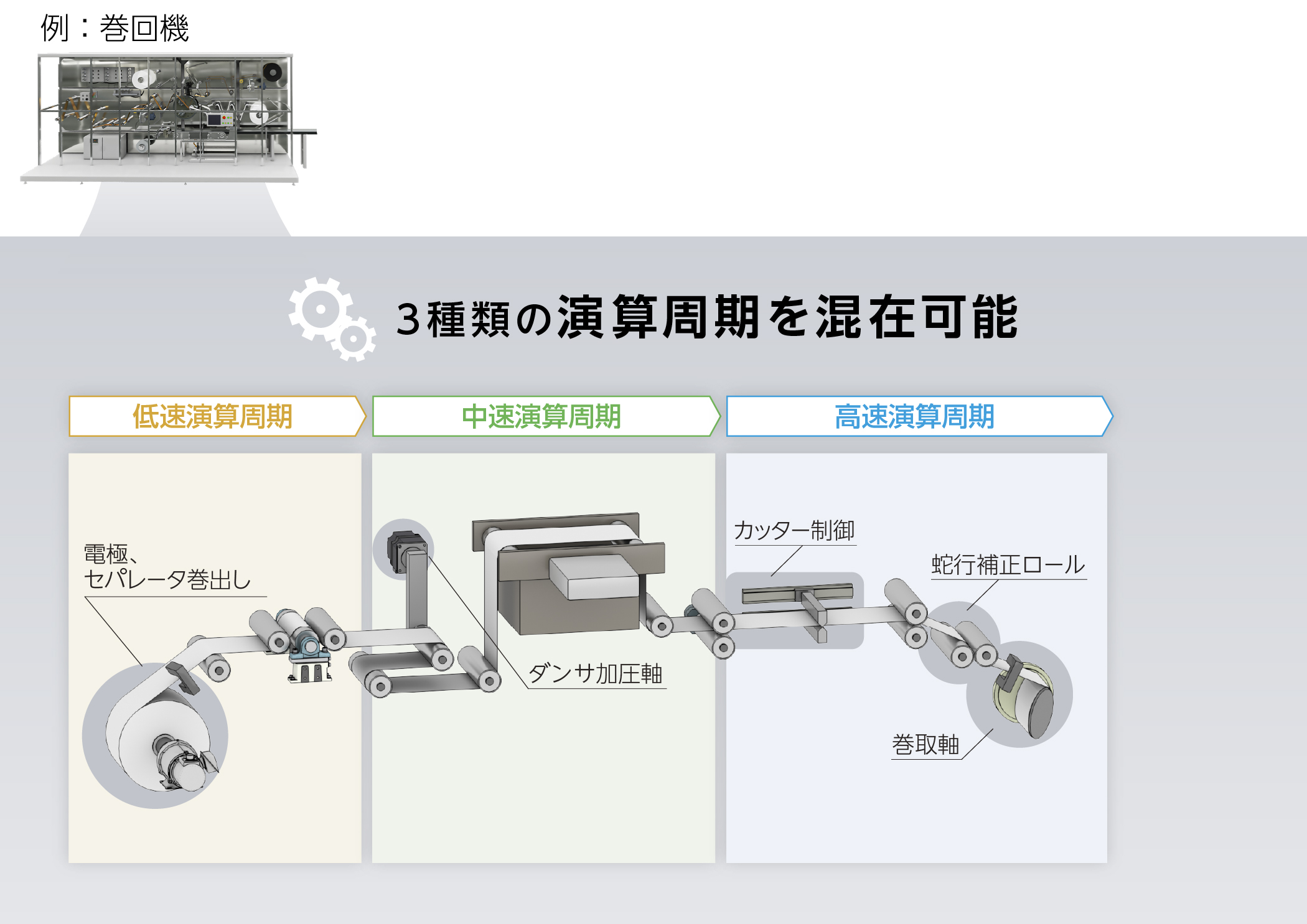 シーケンス/モーション/ネットワークの3つの制御を一体化した高性能マルチコアMPUを標準搭載し、最大256軸の多軸制御を実現。演算周期の混在ができ、多軸でも高速演算周期による制御が可能です。各機構の細かな制御から製造ライン全体の制御まで、コントローラ1台で対応できます。