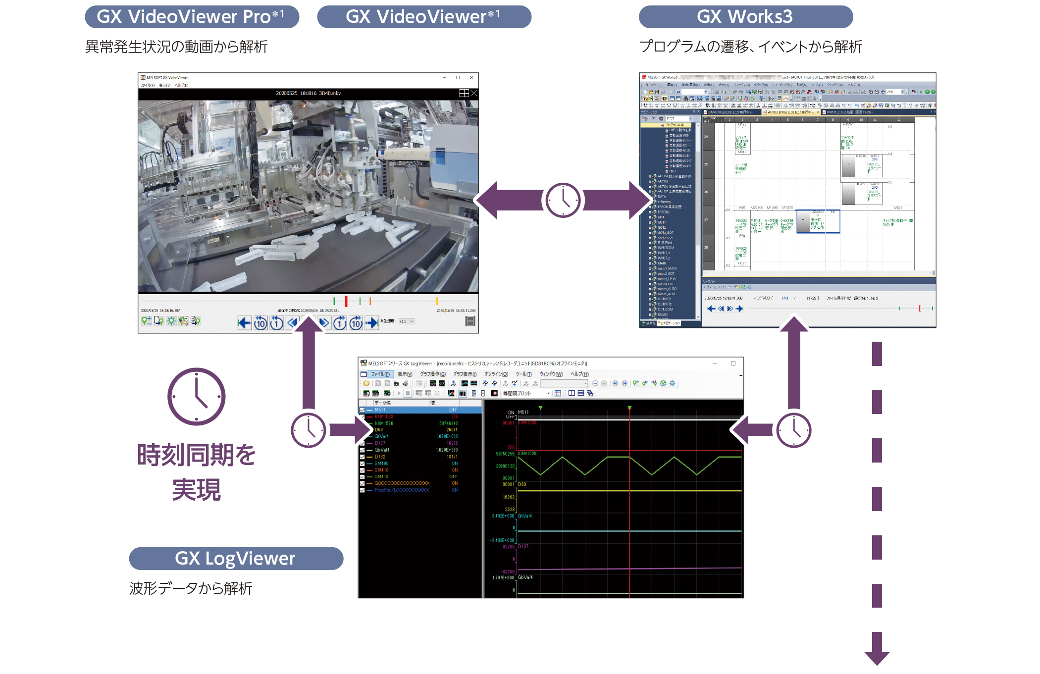 トラブル発生前後の各装置・機器の制御データに加え、ワークの状態やオペレータの操作履歴をまるごと記録します。記録した波形データ、プログラムと動画などを時刻同期して表示できるため、原因を簡単に特定できます。