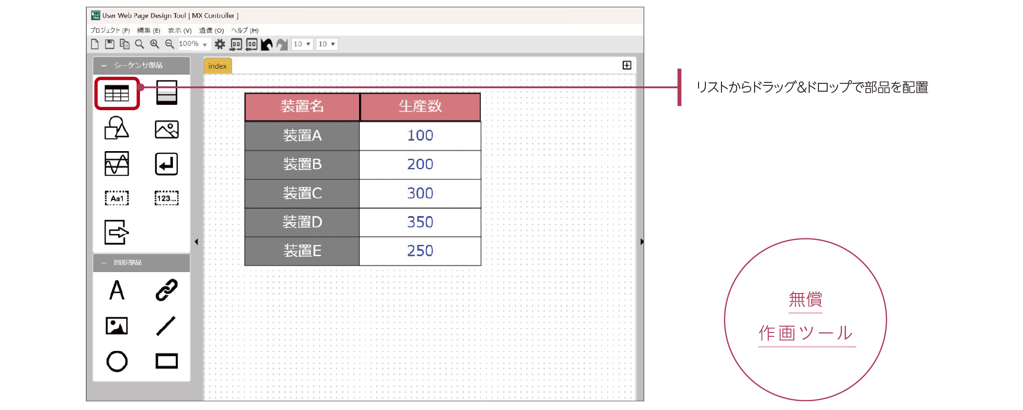 部品を配置し、デバイス設定するだけで作成できるため、プログラミングの知識は不要です。