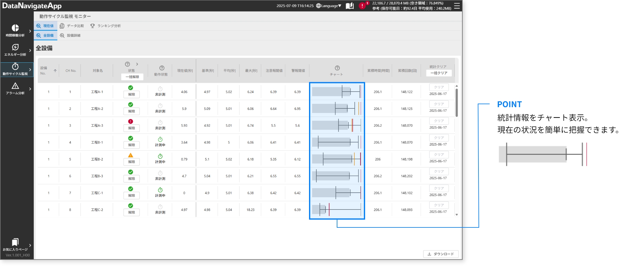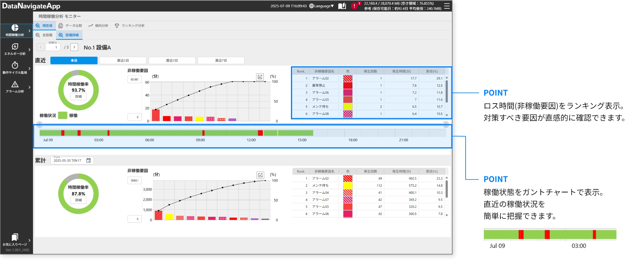 設備の稼働状態(稼動、停止、非稼働等)を可視化・分析するアプリです。