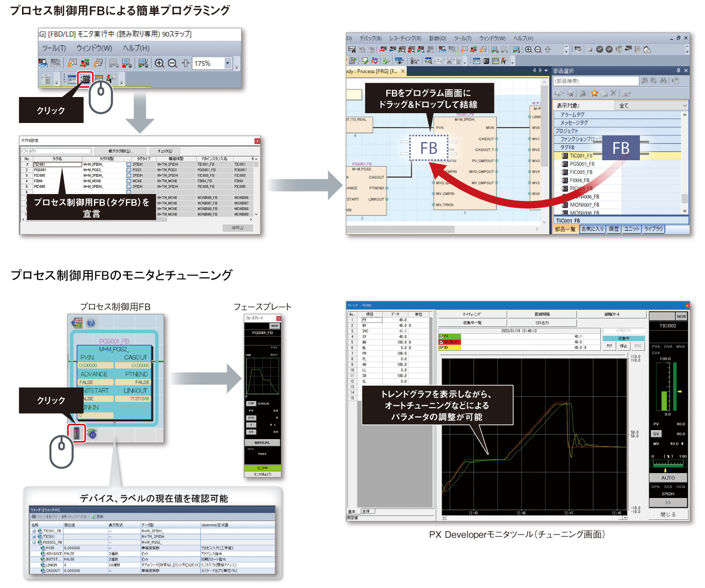 • プロセス制御用のタグFBは、フェースプレートによるモニタのほか、PX Developerモニタツールでのトレンド表示や、オートチューニングを活用したパラメータ設定が可能なため、システムの立ち上げ調整が容易に行えます