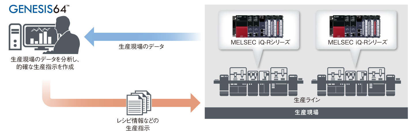 - 生産現場から収集したデータをSCADAソフトウェアGENESIS64™などを活用して分析し、その分析に基づいた生産指示を関連するシステム全体に出せます