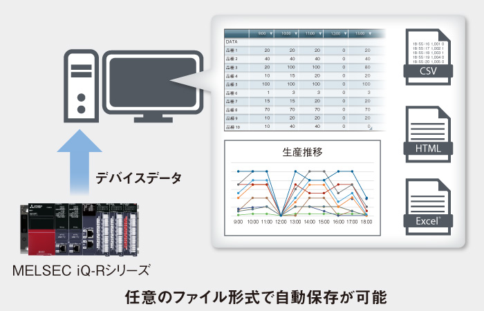 - 高速データロガーユニットを活用することで各工程の生産実績データを最速0.5msで収集し、Excel®/CSV形式の視覚的にわかりやすいグラフなどで生産状況を把握できます