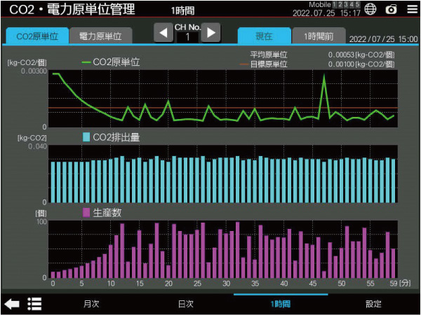 CO2排出量、エネルギー原単位、生産数、電力量を簡単に確認できます。電力量、生産数のデータを保存し、生産ラインや設備の工程ごとでエネルギーロス分析に活用できます。