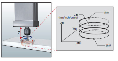 2軸円弧補間制御に直線補間軸(直線制御)が追従することで螺旋の軌跡を描く制御です。