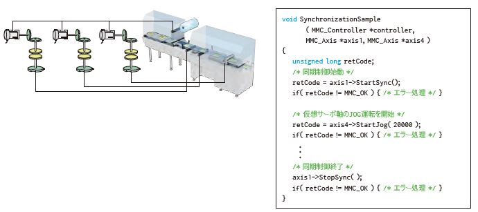 ギア、シャフト、クラッチ、変速機、カムなどの機械機構をソフトウェアに置き換えた同期制御が可能です。カム自動生成機能によりカム生成を簡単に実現します。軸ごとに同期制御の始動、停止ができ、同期制御軸と位置決め制御軸の混在が可能です。