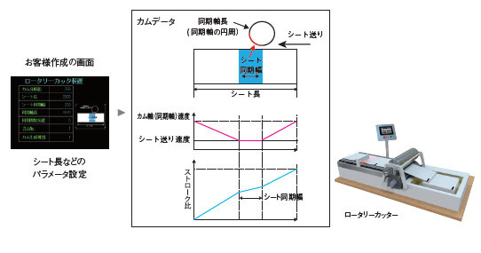 シート長、同期幅、カム分解能などを入力するだけで、カムデータを簡単に作成できます。