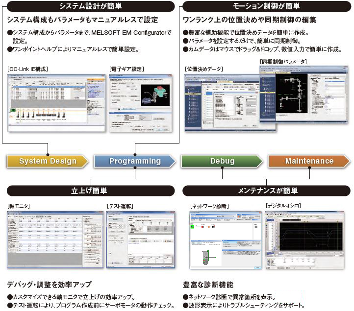 MELSOFT EM Software Development Kitは、シンプルモーションボードのシステム設計・プログラミングから、デバッグ、保守まで、すべてのシーンに対応できるソフトウェア開発キットです。