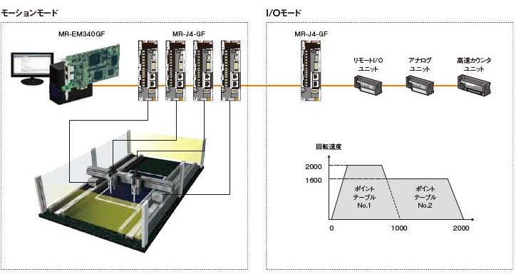 複数軸の位置決め、同期制御など幅広いモーション制御ができるモーションモードと、1軸での位置決めができるI/Oモードがあり、用途により使い分けができます。