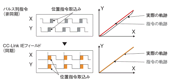 CC-Link IE フィールドネットワークの同期通信で、同期制御や補間機能を実現。同期が必要な食品機械、加工機などの装置にも対応できます。