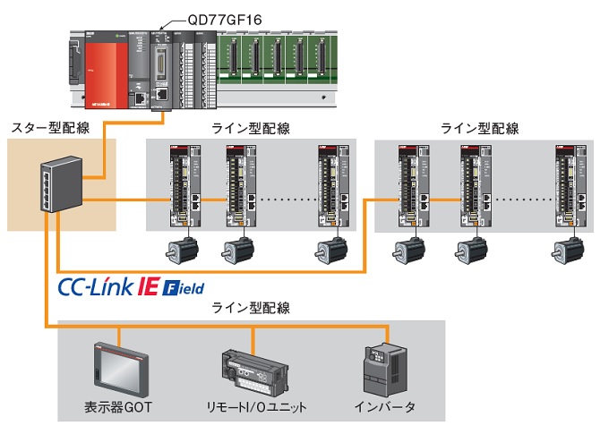 CC-Link IE フィールドネットワークの配線には、スター型、ライン型、スター型・ライン型混在の配線を使用することができます。
