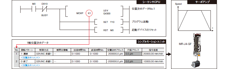 - 位置決めアドレス、速度などをシーケンスプログラムから設定して、手軽に自動運転ができます。
