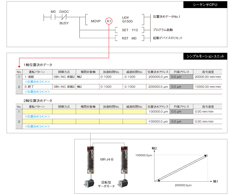 - 位置決めアドレス、速度などをシーケンスプログラムから設定して、手軽に自動運転ができます。