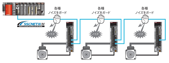 動力線や外部装置などから混入するノイズ等に対し、対ノイズ性が飛躍的に向上しています。