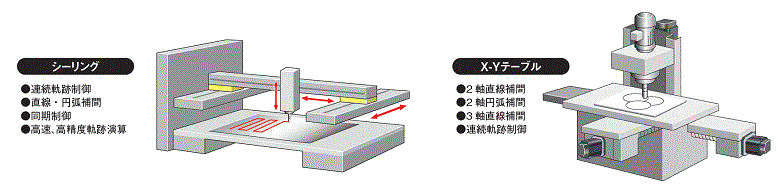 - 直線補間制御、2軸円弧補間制御、定寸送り制御、現在値変更、および連続軌跡制御など豊富な制御で様々な用途に対応できます。