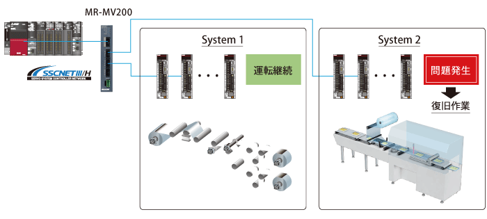 光分岐ユニットで分散配置をすることにより、部分電源OFFが可能です。分岐されたサーボアンプの電源OFFは他の分岐されたサーボアンプに影響を及ぼさないため、復旧時間の短縮が可能です。