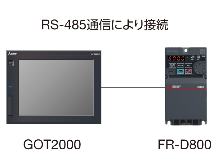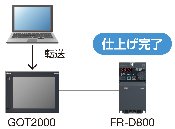 GOTとの連携により、パソコンレスでインバータの立上げ、調整、保守が可能になります。