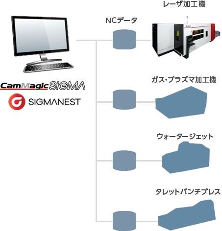 レーザ加工機、ガス、プラズマ、ウォータージェット加工機、タレットパンチプレスなど、多様な加工機にNCデータの供給が可能です。
