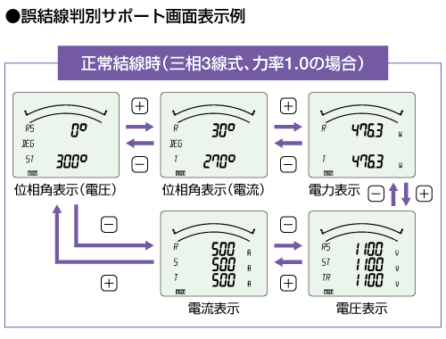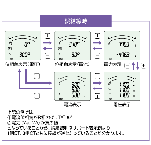 2:すべての誤結線を判別できるものではありません。電圧入力を誤結線かつ電流入力を誤結線した場合は、異なる誤結線パターンを表示する可能性があります。