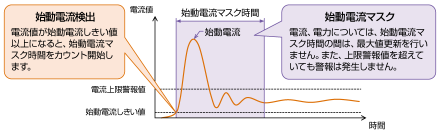 モータの電流監視を行う際に、モータ始動電流マスク機能を使用することでモータの始動電流による最大値更新や警報出力を防ぐことができます。最大値の更新は行いませんが、現在値表示は行います。始動電流マスク時間は、1秒から最大5分まで設定できます。