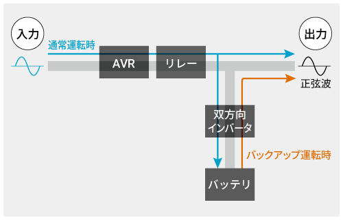 入力電源を、双方向インバータ回路経由でバッテリを充電すると共に、そのまま出力します。また、入力電圧の変動に対してはAVR ※ が動作し出力を100V±10%以内に安定化させます。