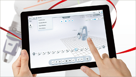 • アームを動かして位置を記憶させる「ダイレクトティーチング」、画面のタッチ操作でできる「ビジュアルプログラミング」が可能です。