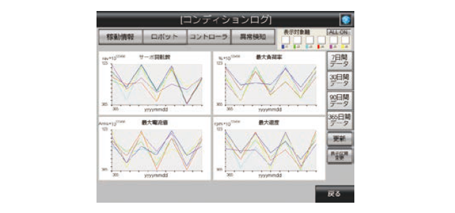 日々のロボットコンディション情報(稼動情報、ロボット情報、コントローラ情報、異常検知情報)をグラフ確認いただけます。GOTから稼動状況解析やメンテナンス要否の確認が可能です。