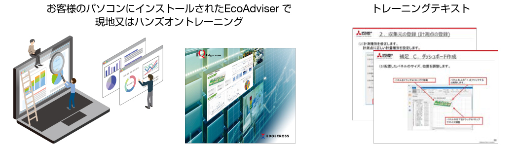 お客様のパソコンにインストールされたEcoAdviserを用いて、ダッシュボード作成のための操作方法を、弊社専門員が現地又はハンズオンにてお客様にトレーニングするメニューです。