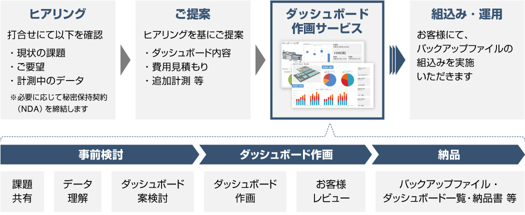 - ご提供いただくデータによっては、お客様の希望どおりのダッシュボードを提供することができない場合があります。(内容充実化のための追加計測等を提案いたします)