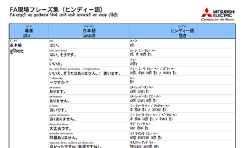 生産現場でよく用いられるフレーズを場面別(設計・製造・保守等)に整理し、FA現場フレーズ集(ヒンディー語、グジャラート語、カンナダ語、タミル語、英語等)に纏めました。現地スタッフとのスムーズなコミュニケーションの一助としてご利用ください。