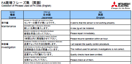 生産現場でよく用いられるフレーズを場面別(設計・製造・保守等)に整理し、FA現場フレーズ集に纏めました。現地スタッフとのタイ語、インドネシア語、ベトナム語、マレーシア語、ミャンマー語、英語他でのスムーズなコミュニケーションの一助としてご利用ください。