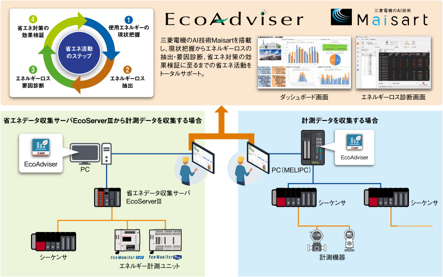 電力量などのエネルギー情報やシーケンサ(PLC)に蓄積された生産情報を取り込み、AI技術を活用することで様々な分析を実施することが可能です。