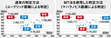 - 正常データから基準(単位空間)を作成し、基準と測定データの乖離度合い(マハラノビス距離)を数値化することで、正常/異常を判定。
