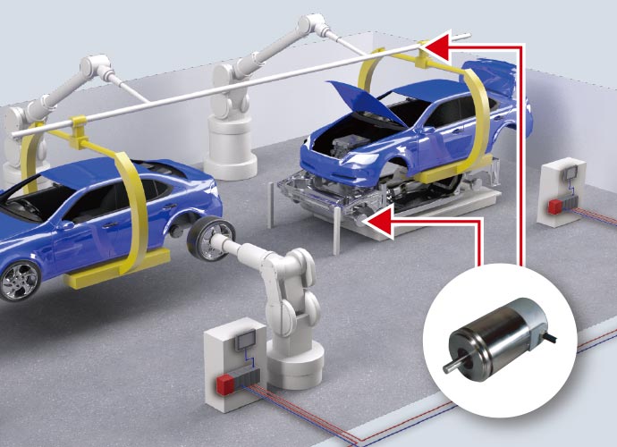 回転方向や直線方向の機械的変位量をデジタル量に変更することで、コンベアラインのメインラインとサブラインの位置を検出し、ラインの同期制御ができます。