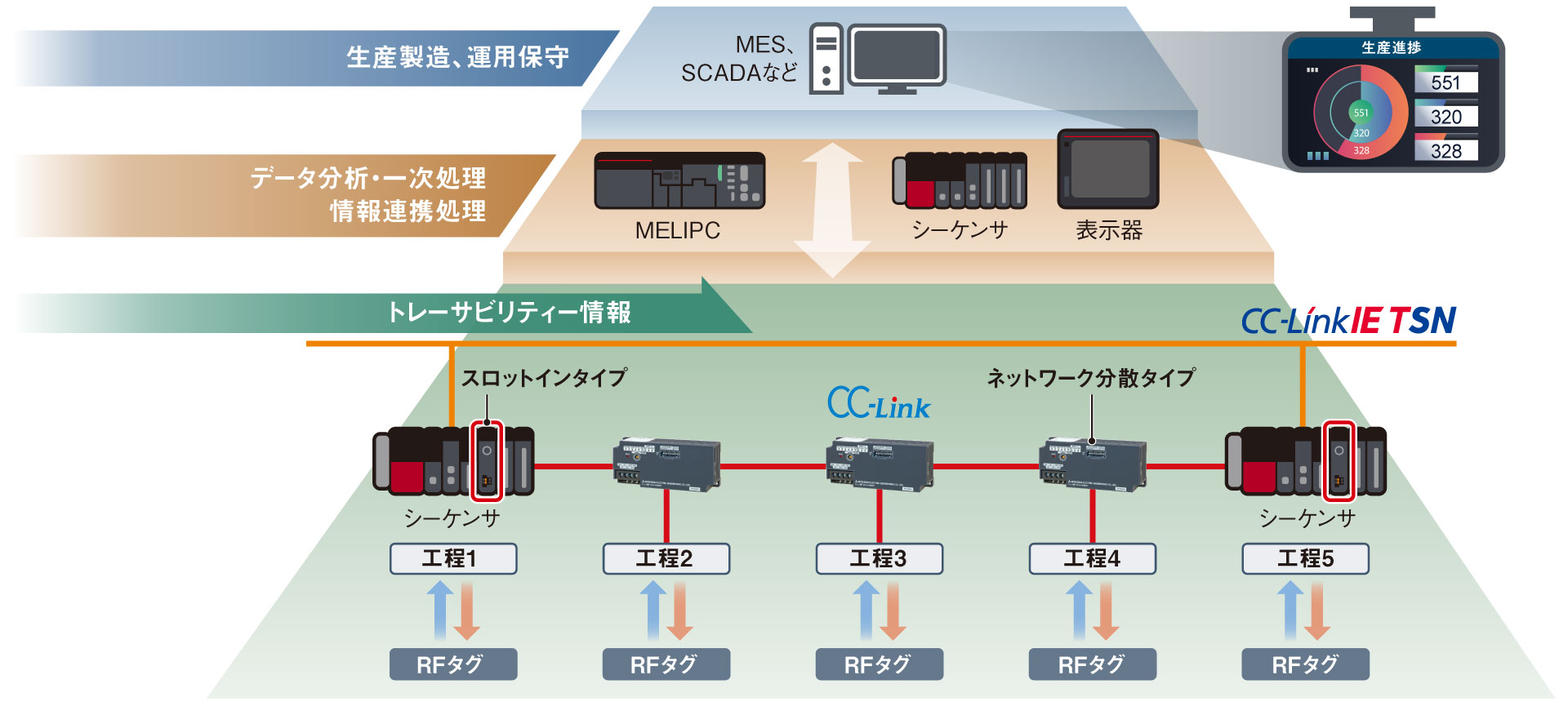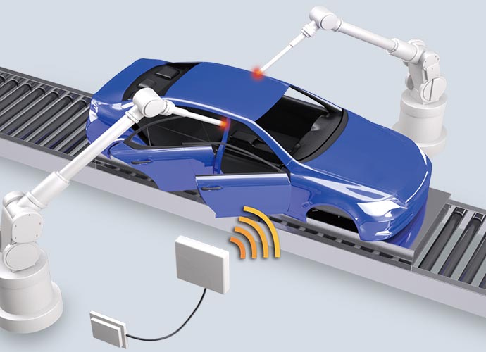 台車に取り付けたRFタグに車種情報、作業指示内容などを書き込んでおき、工程ごとにRFタグの内容を読み取ることで個別の作業を指示できます。さらに、各工程での履歴情報を書き込むことで簡単にトレーサビリティー環境を構築できます。