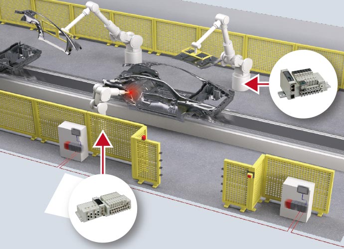 溶接ロボットを使った溶接冶具のエアシリンダのクランプ、アンクランプの駆動ができます。