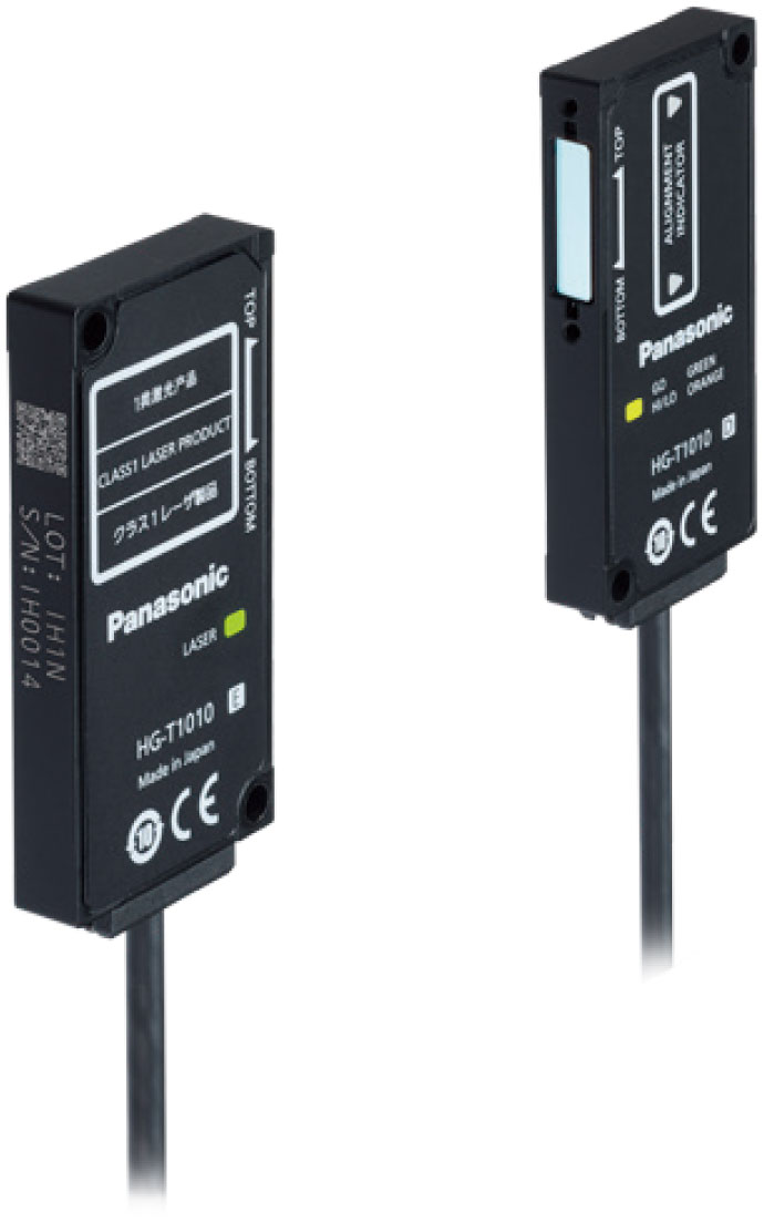 - 透過型デジタル変位センサHG-Tは、投光に10mmの帯状レーザを採用。受光にCMOS素子を採用した高精度位置計測を実現します(設置距離20mm時:繰返精度1µm、平均回数16回)