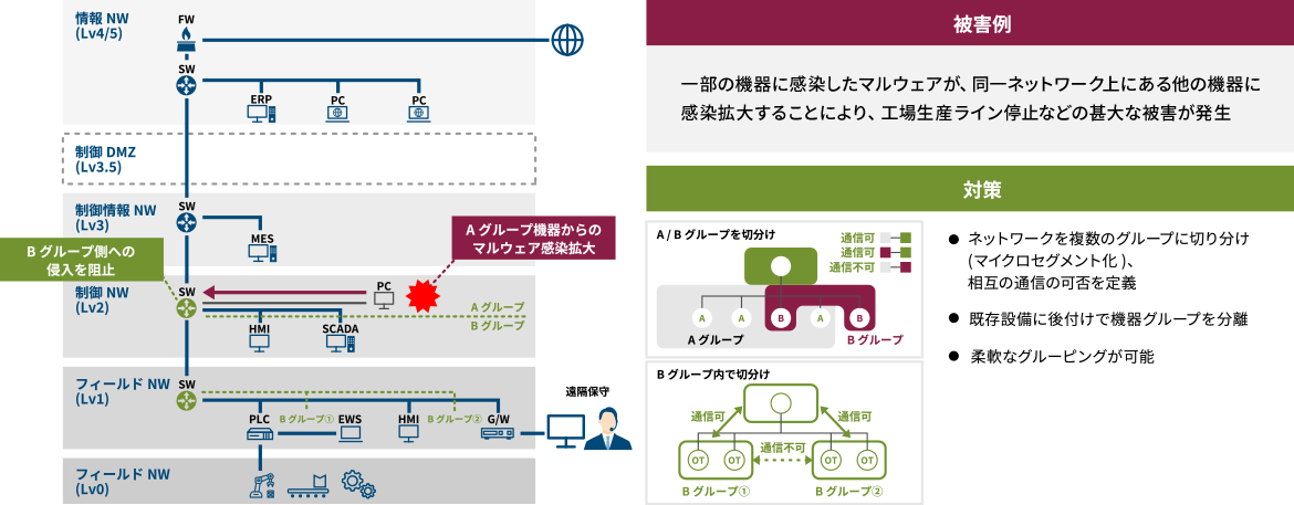 「マイクロセグメント化」ソリューションは機器などの単位でネットワークを細かく論理的に分割するソリューションであり、これにより製造現場全体へのサイバー攻撃の波及を防ぐことが可能です。