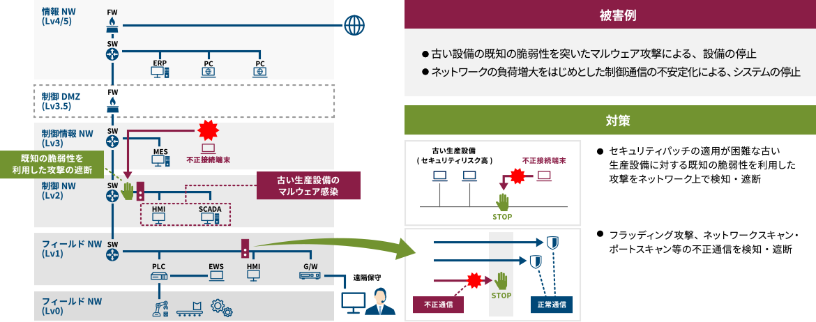 また、ネットワーク上で攻撃を検知・遮断し生産設備の停止リスクを低減