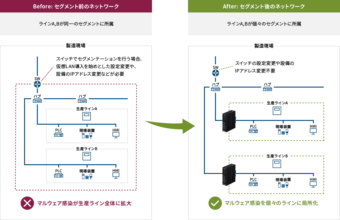 セグメンテーションIPアドレスなどの情報をもとに通信を許可・拒否(遮断)することで、生産ラインごとにセグメント化。マルウェア感染の拡大を防止。