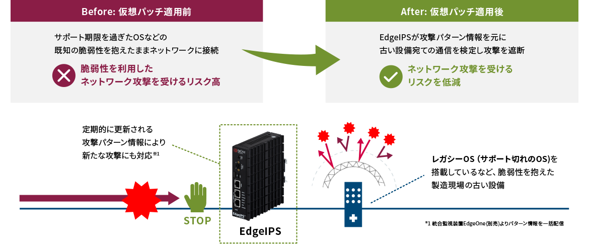 製造現場の古い設備は既知の脆弱性を抱えており、セキュリティリスクが高い状態にあります。しかし、生産設備そのものに対する対策はセキュリティ対策製品のインストールやセキュリティパッチの適用が困難であり、多くの時間とコストを要します。仮想パッチはこのような古い設備の脆弱性を利用した攻撃をネットワーク上で遮断することで設備を保護し、攻撃を受けるリスクを低減します。仮想パッチ適用後は、ネットワーク攻撃を受けるリスクが低減するため、システムの可用性が向上します。
