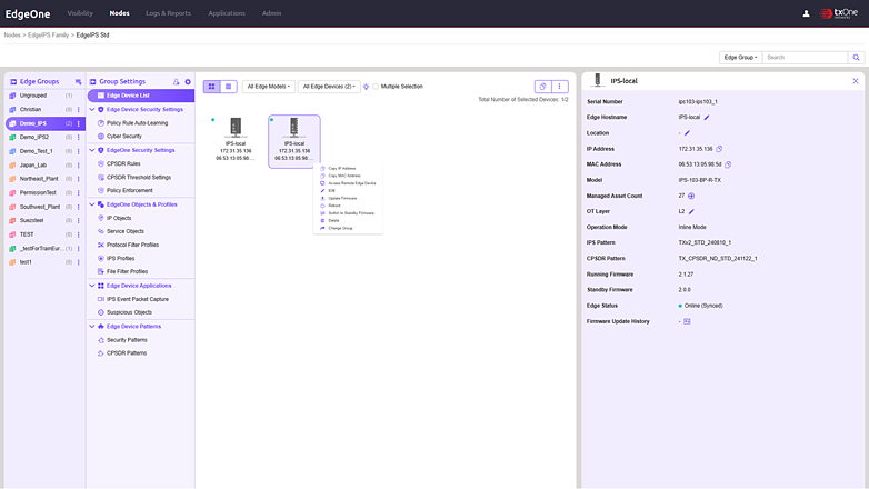 統合監視装置EdgeOneはパソコンやサーバにインストールするソフトウェア製品です。Webブラウザから製造現場に設置したEdgeIPSを一覧で表示し、設定変更や状態監視、ソフトウェアのアップデートなどが可能です。これらの機能によりEdgeIPSの運用の手間を軽減します。