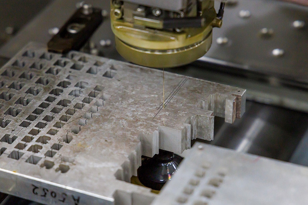 ワイヤ放電加工機ではワイヤからの放電で素材をカットする。加工に時間がかかるため、夜中の間に自動加工させることが多い